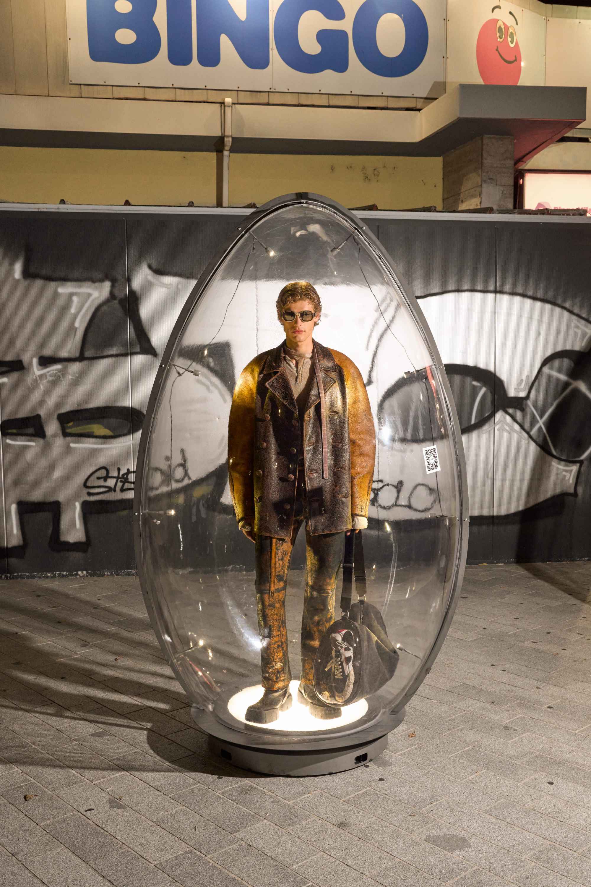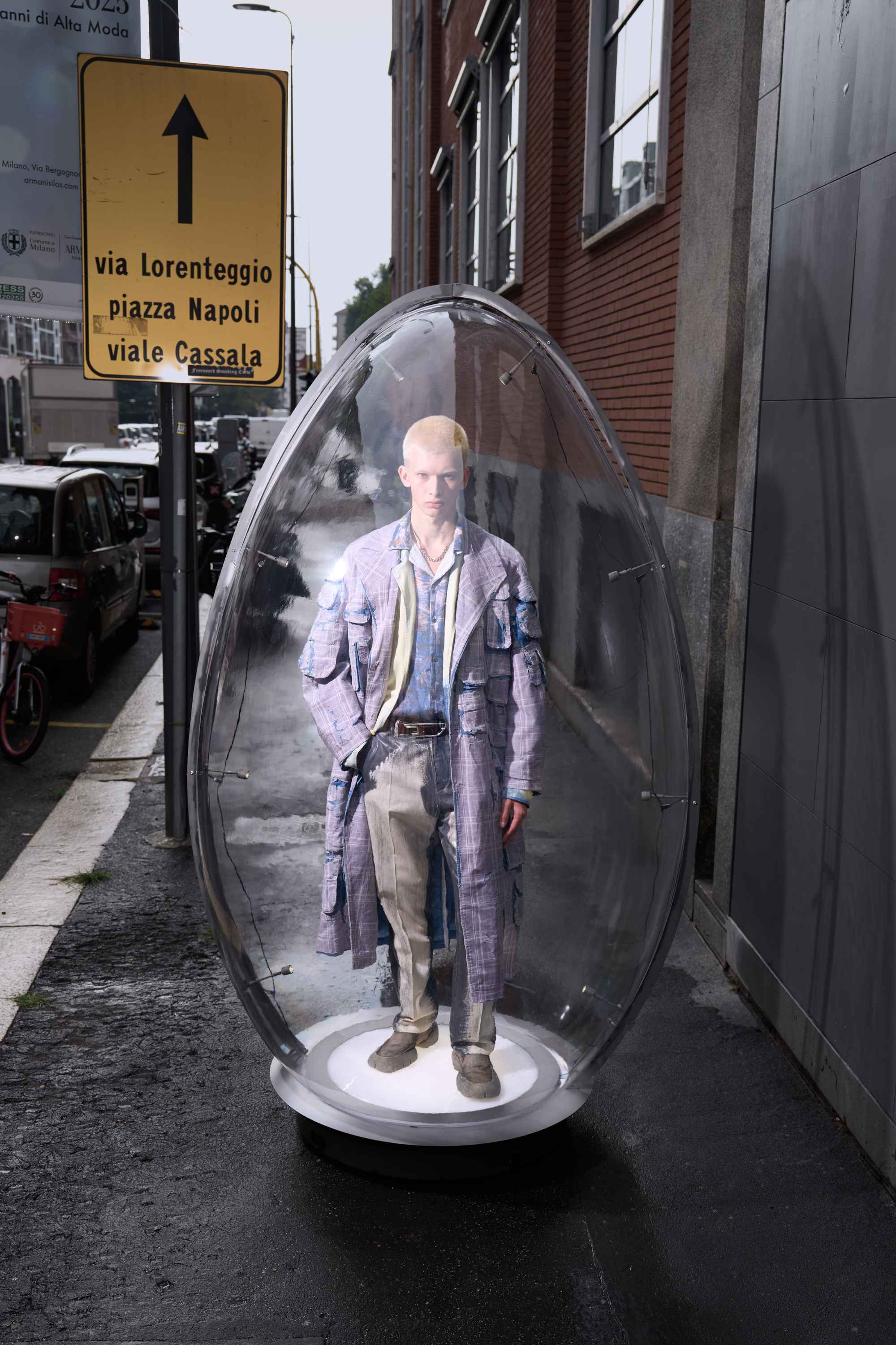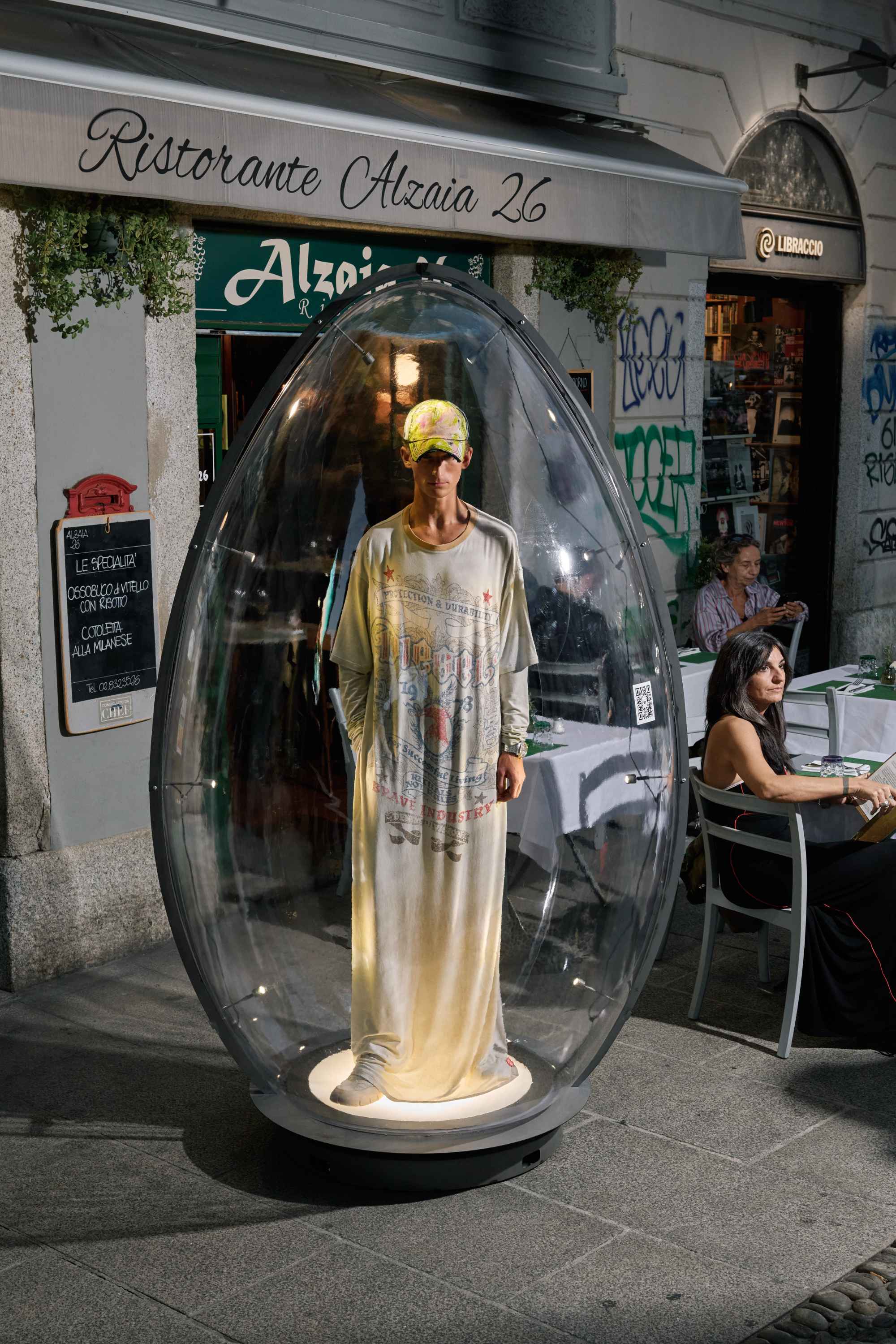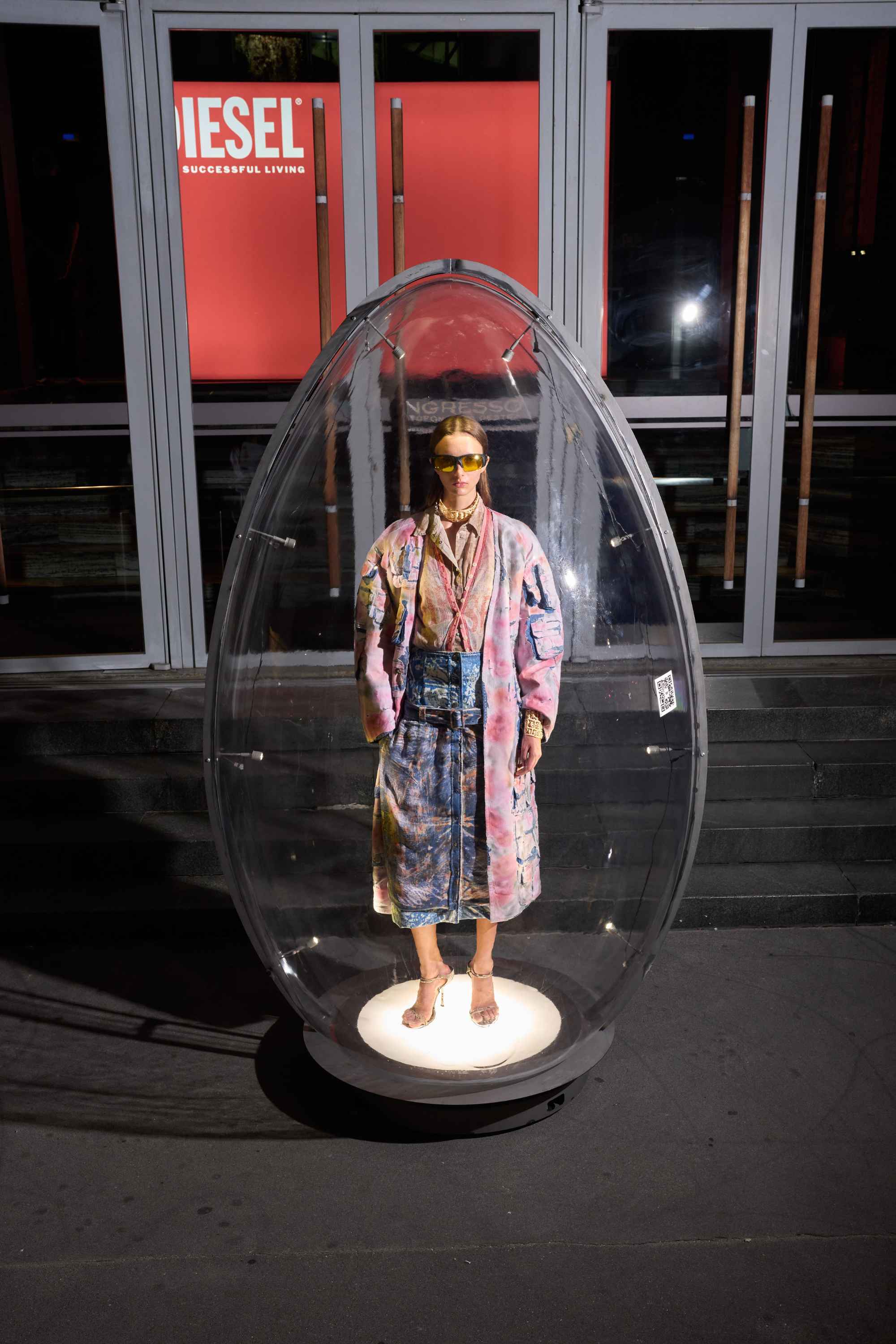 The format turned the fashion experience into something collective and participatory, where the front row was no longer reserved for the elite of editors, buyers, and influencers. At Diesel, fashion is an experience open to all, faithful to its code of rebellion and innovation. To achieve this, Martens reimagined the acrylic eggs from Jurgi Persoons’ iconic 2001 Paris presentation into a monumental urban experience, conceived as “Diesel’s biggest democratic act” with the support of the Municipality of Milan.