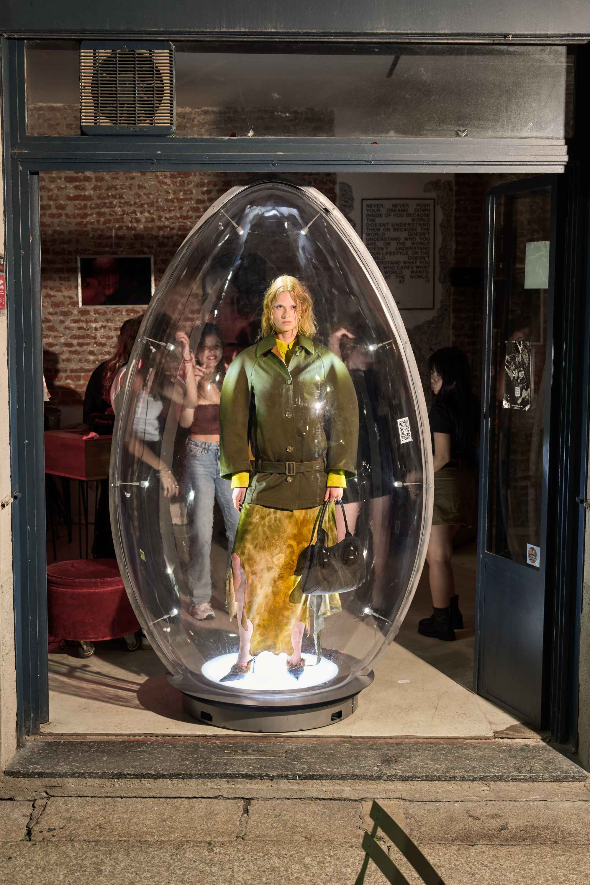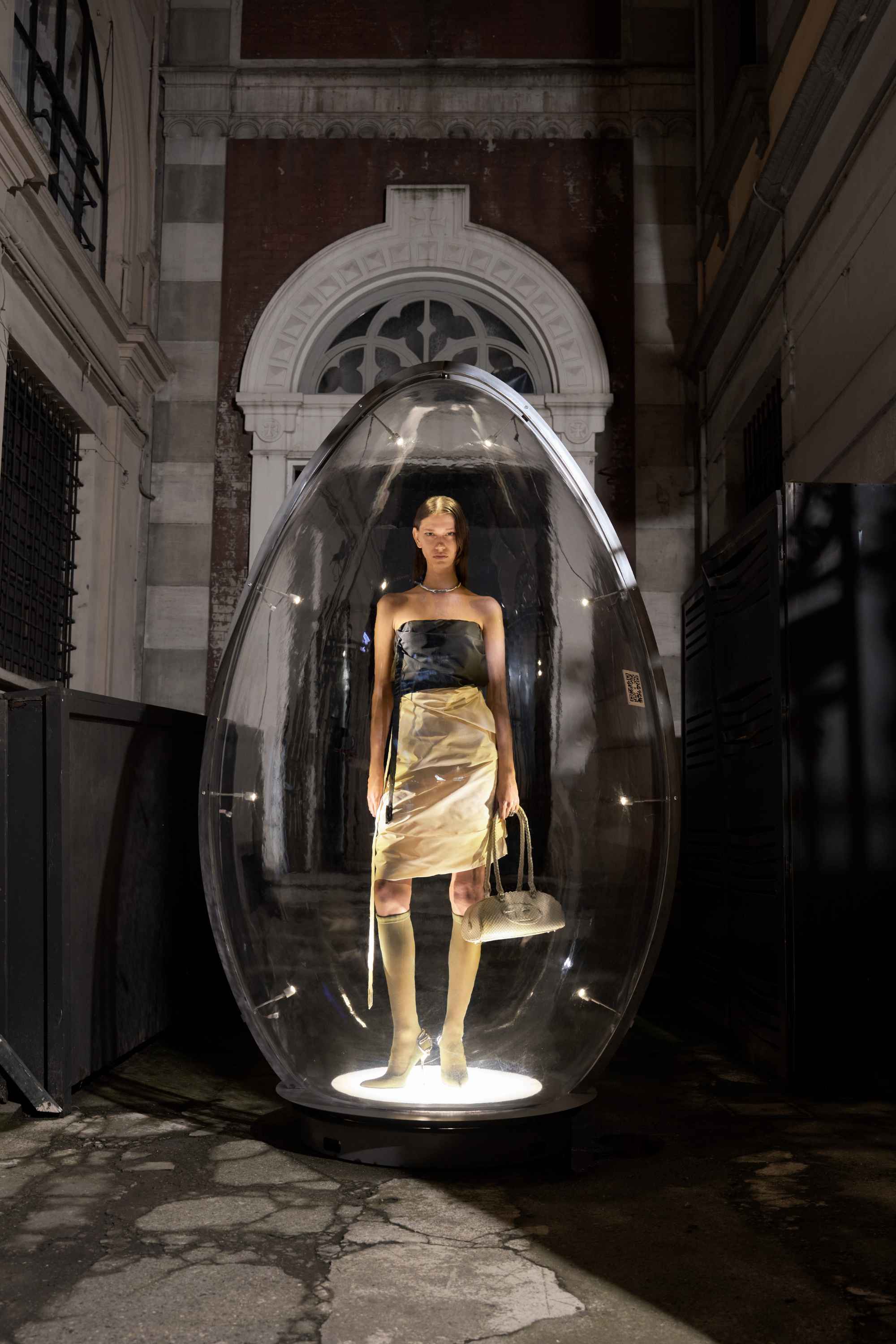 Glenn Martens once again proved that Diesel pushes beyond conventional limits, this time turning Milan into an open playground for the Spring/Summer 2026 collection. Instead of a typical closed runway, the city became a stage where models were placed inside illuminated transparent “eggs,” distributed across different locations—from churches to bars and clubs—inviting the public to discover each look by following clues and scanning QR codes.