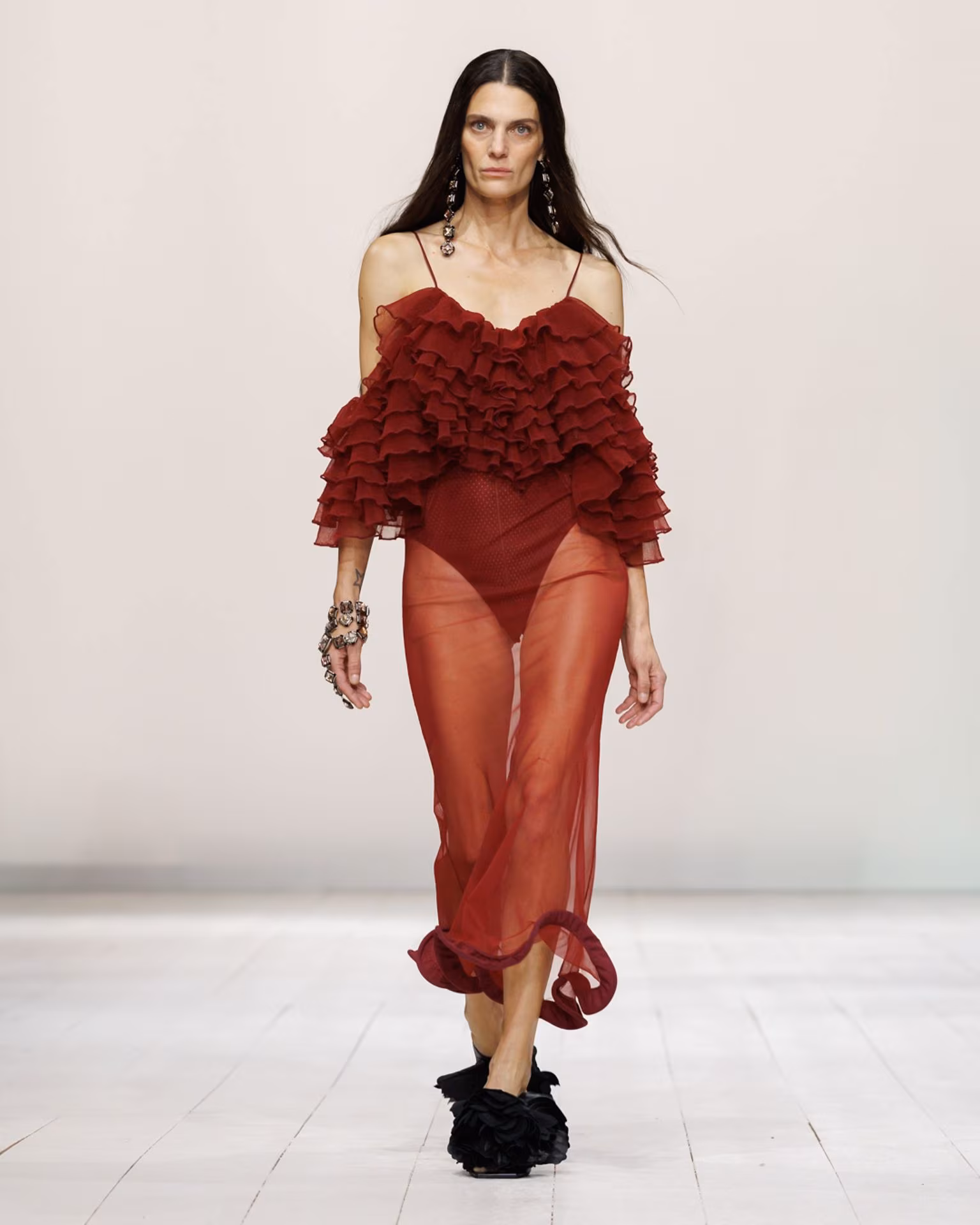 The designer deconstructs the codes of classic tailoring, stripping them of rigidity to reveal a newfound softness. Structures lift away from the body, suggesting lightness. In this delicate tension between dressing and undressing, Burton develops her own vocabulary, one that celebrates the autonomy of the female body without concealing it or imposing armor.
