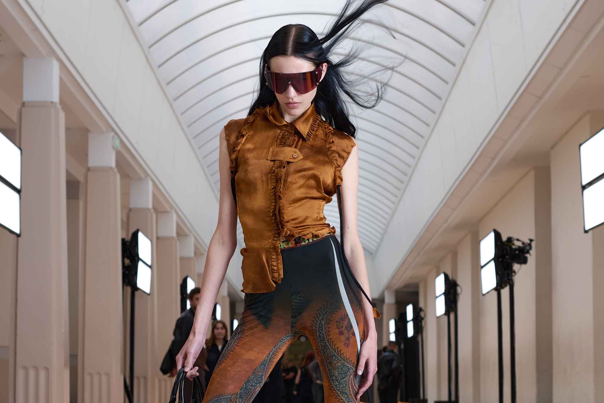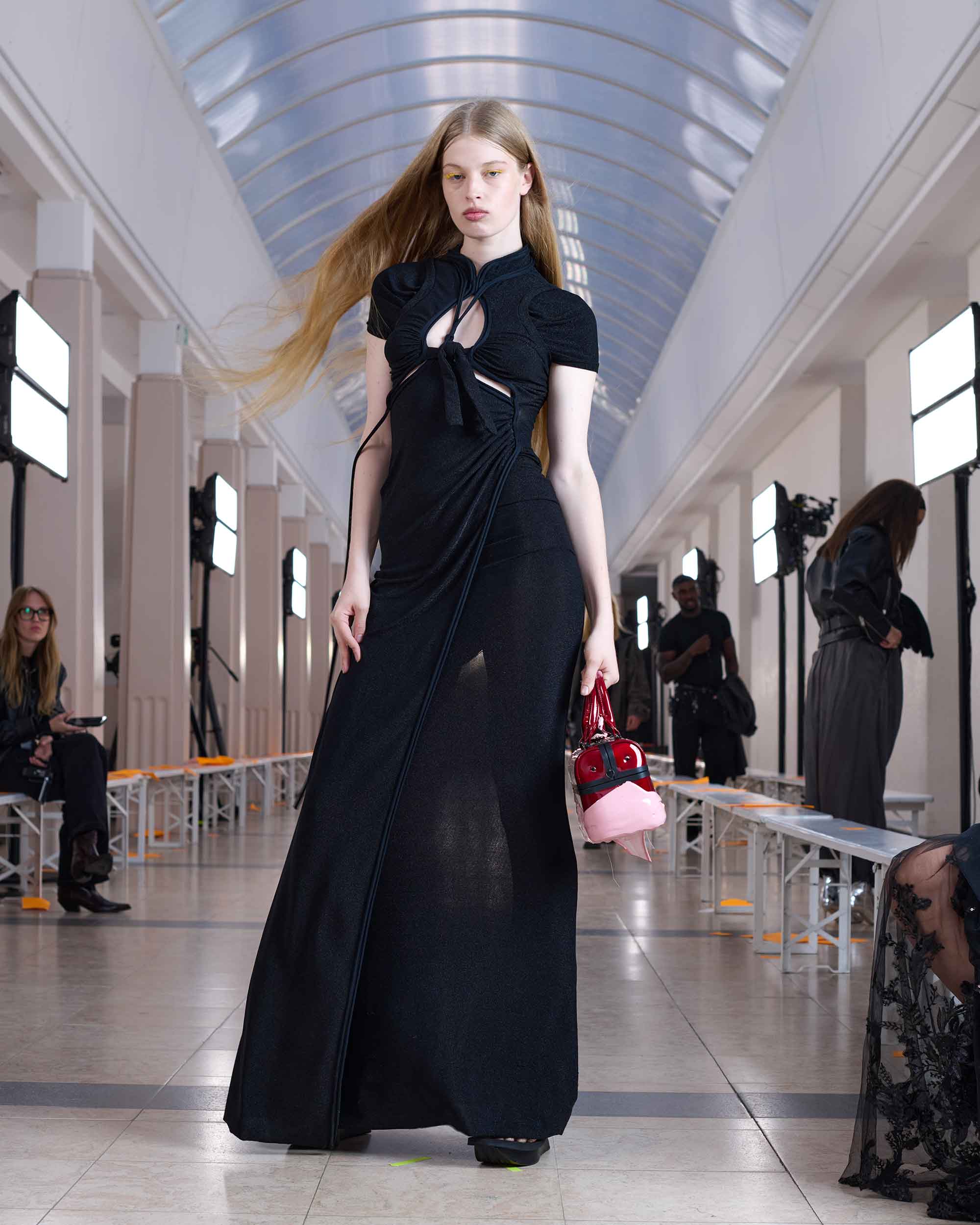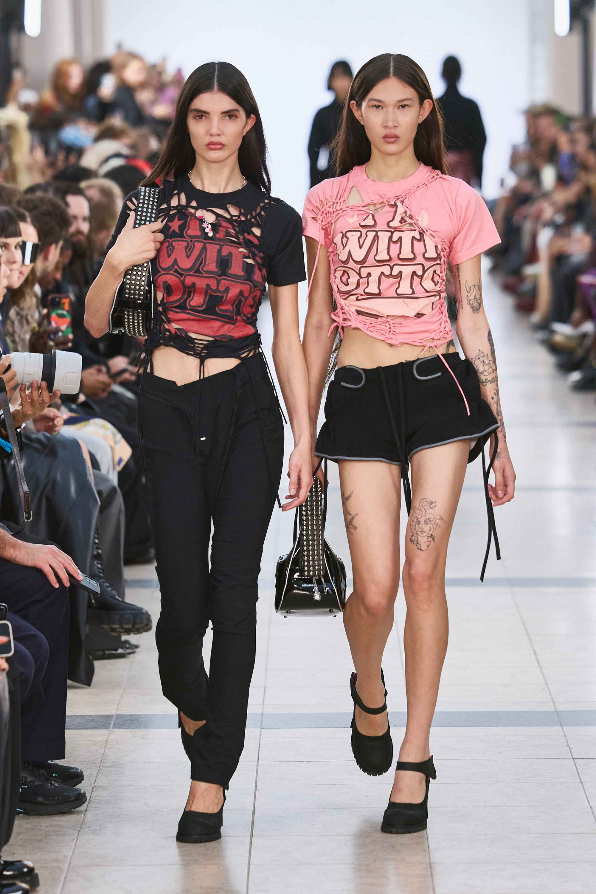 La puesta en escena reforzó el espíritu colaborativo de la colección. Las siluetas moto-style, tan distintivas de OTTOLINGER, reaparecieron reinterpretadas en un equilibrio preciso entre denim y cuero, combinando potencia y vulnerabilidad en una misma línea visual. Previo al desfile, OTTOLINGER lanzó una colaboración con @angel.dewdrops, publicando videos stop-motion de muñecas Blythe desfilando. Una previa que ya anticipaba la narrativa de complicidad y juego que atraviesa toda la colección. La presencia inesperada de Vivien Wilson aportó una dimensión adicional al casting y reafirmó el valor de la individualidad dentro de la colectividad que la marca celebra.