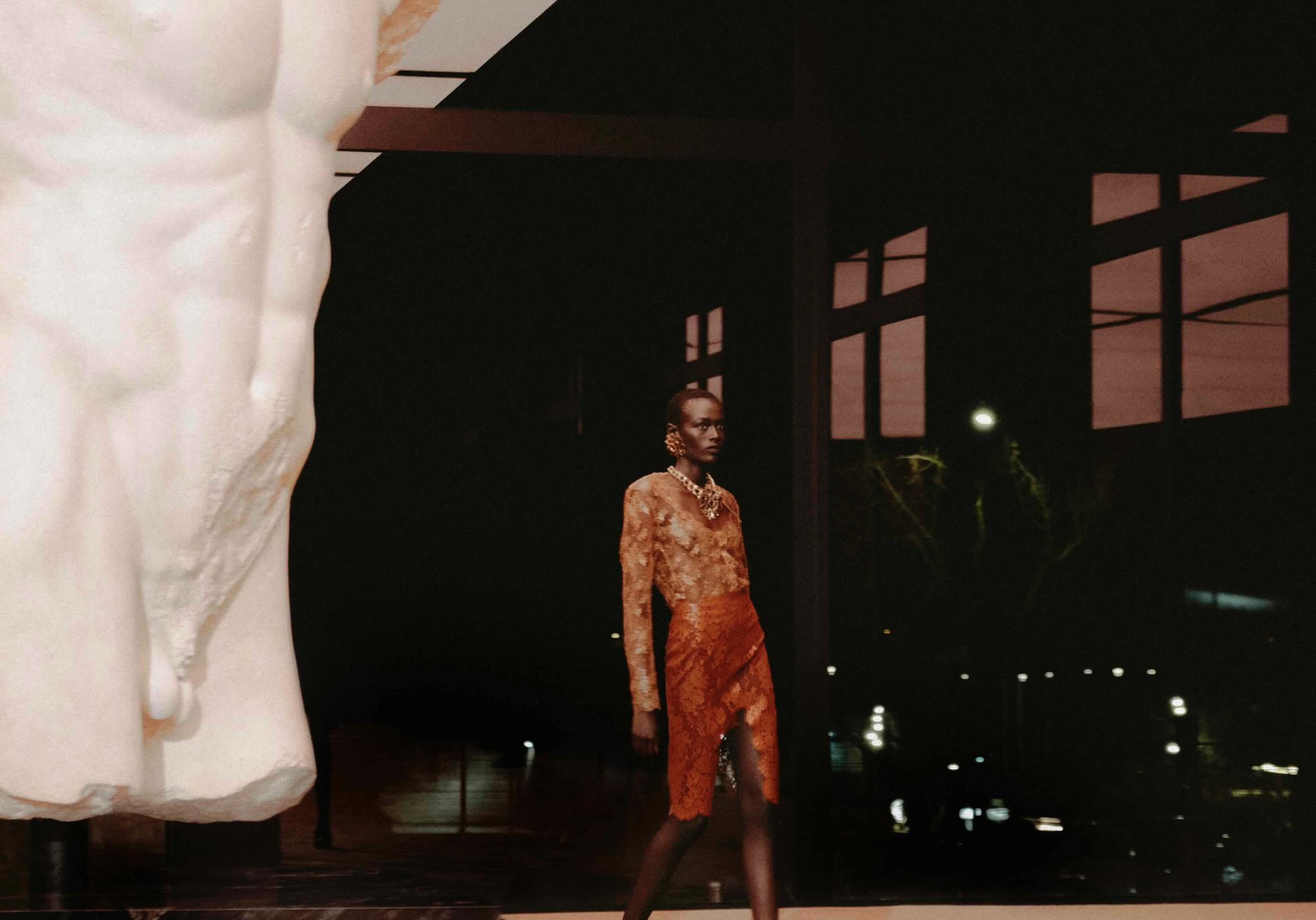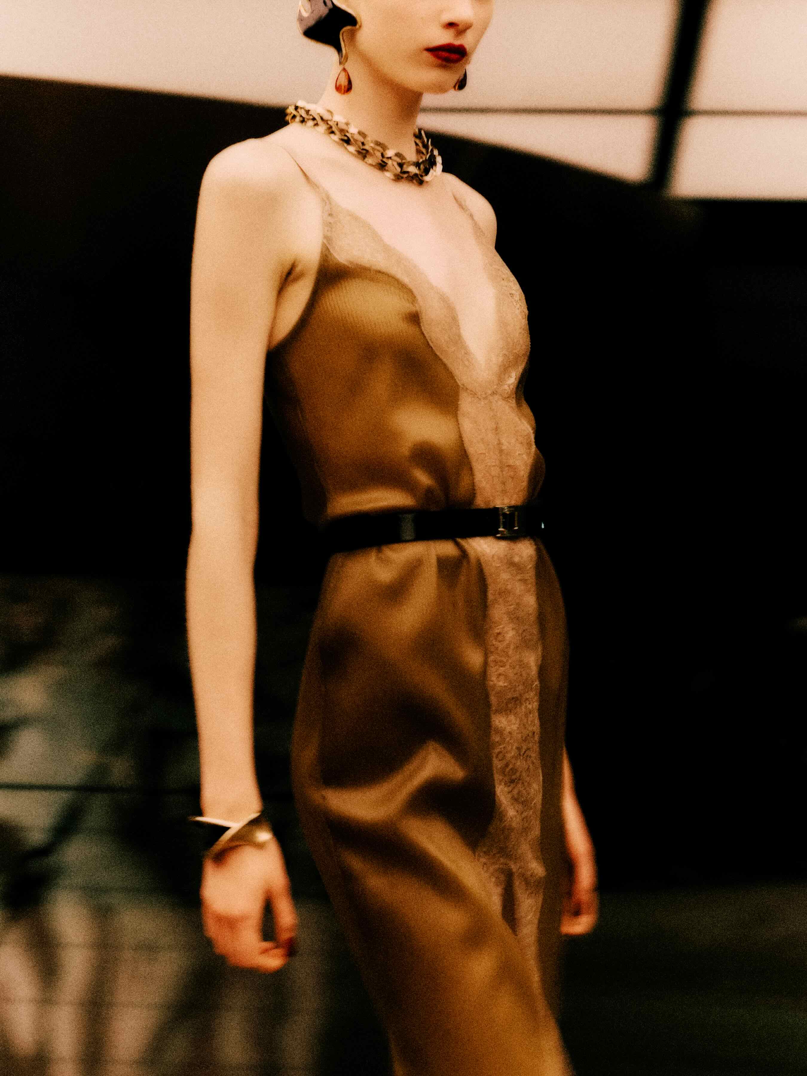 Lace transparencies emerged as one of the collection’s most visible elements. They appeared in fitted skirts, bodysuits and long dresses layered over minimal foundations. The effect was never overt; instead, it suggested a restrained, almost nocturnal sensuality—clothes seemingly imagined for a woman moving effortlessly between dinners, parties and late nights in the city.