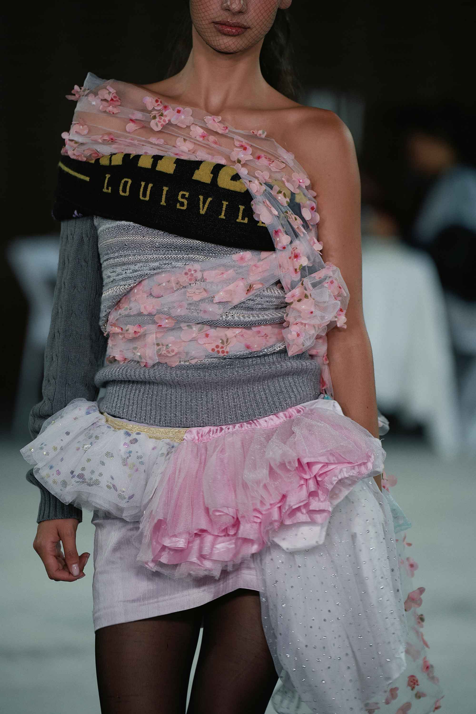 La dicotomía entre el exterior festivo y la vulnerabilidad de los secretos se materializa en una colisión de texturas. Los vestidos de gala dialogan con camisetas, encaje y lencería. Lo voluminoso convive con lo íntimo. Lo ceremonial se fractura con lo cotidiano.
