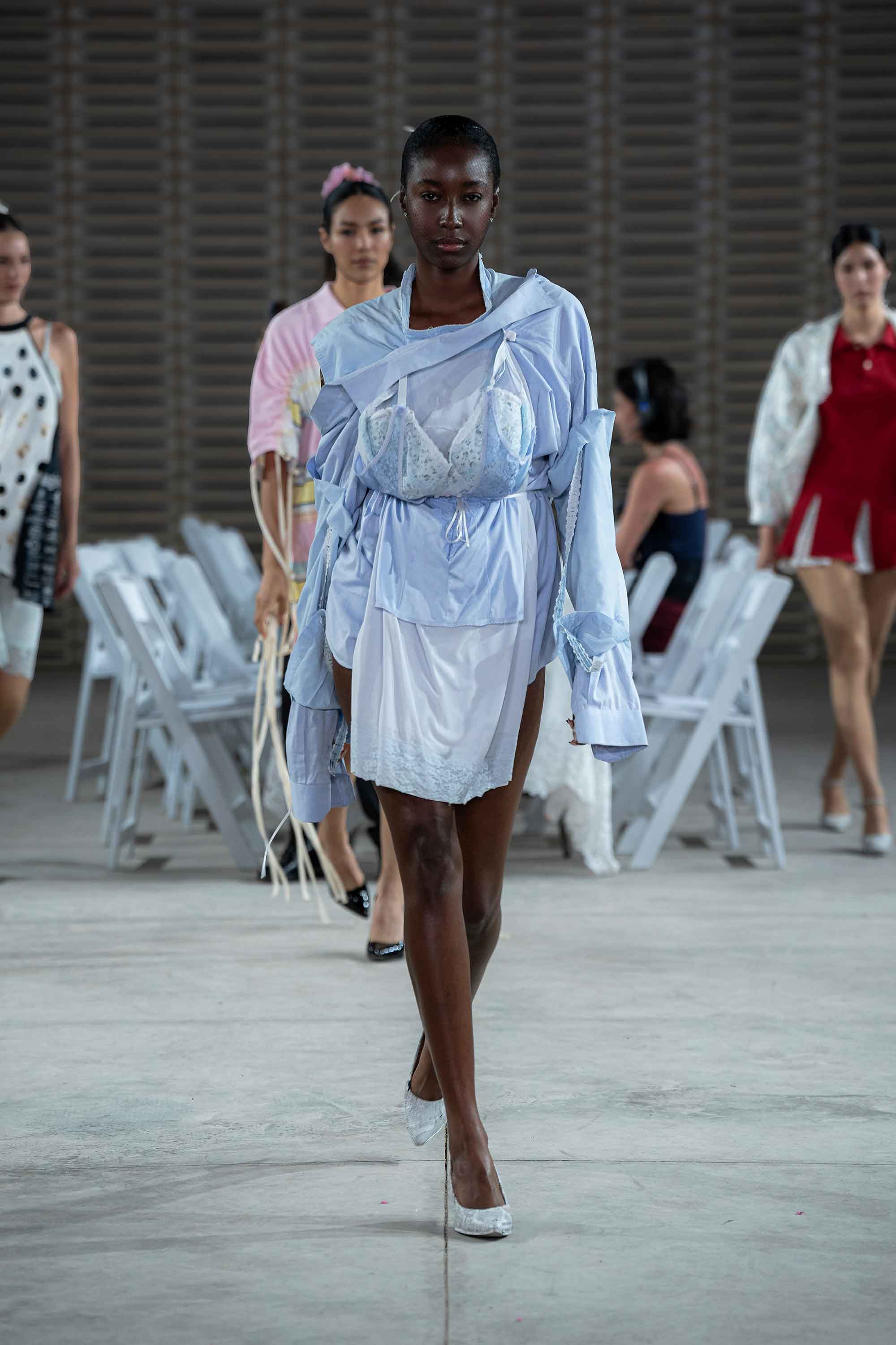 This tension between festive exterior and private vulnerability is rendered through a collision of textures. Eveningwear meets T-shirts, lace and lingerie. Volume sits against intimacy. The ceremonial fractures into the everyday.
