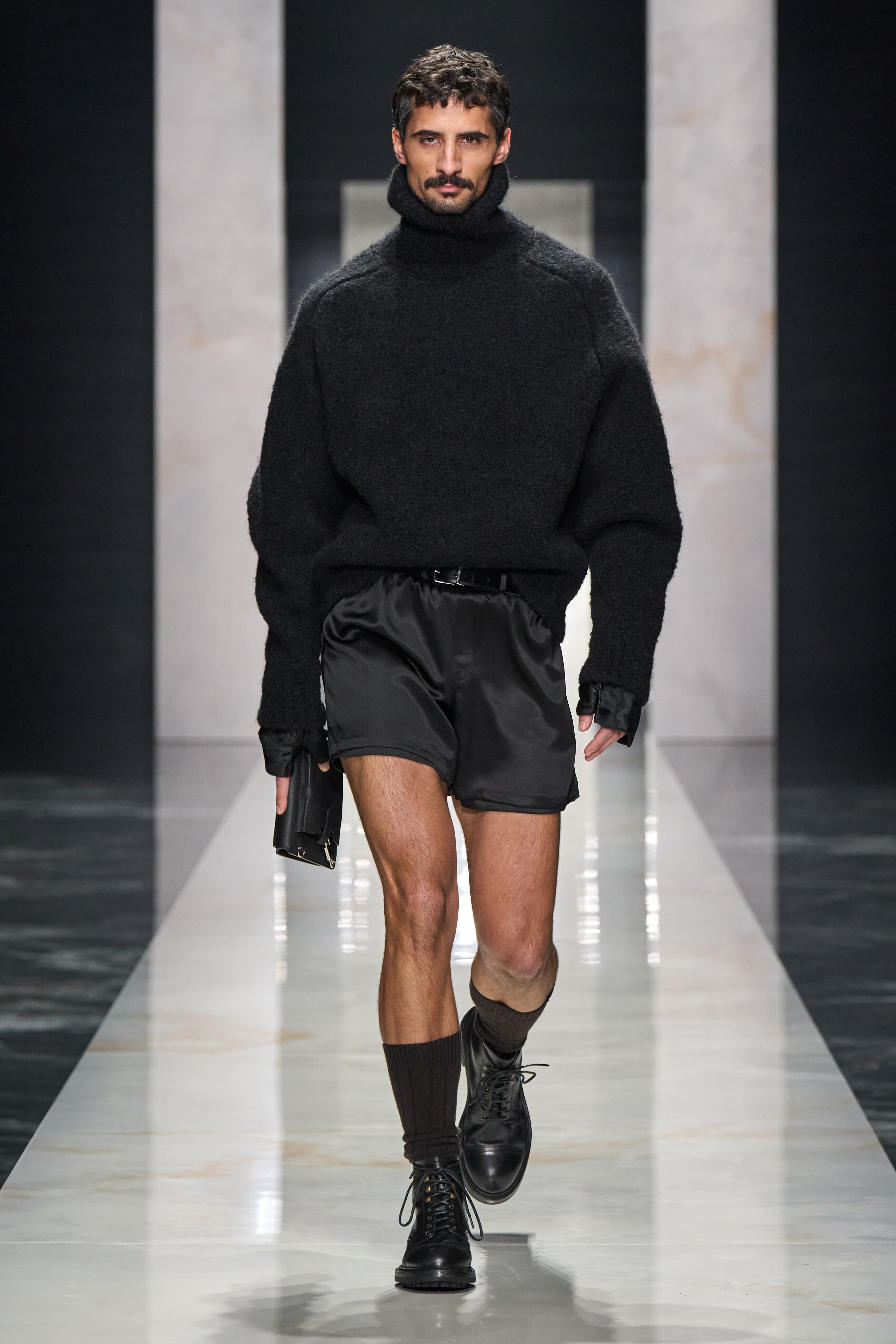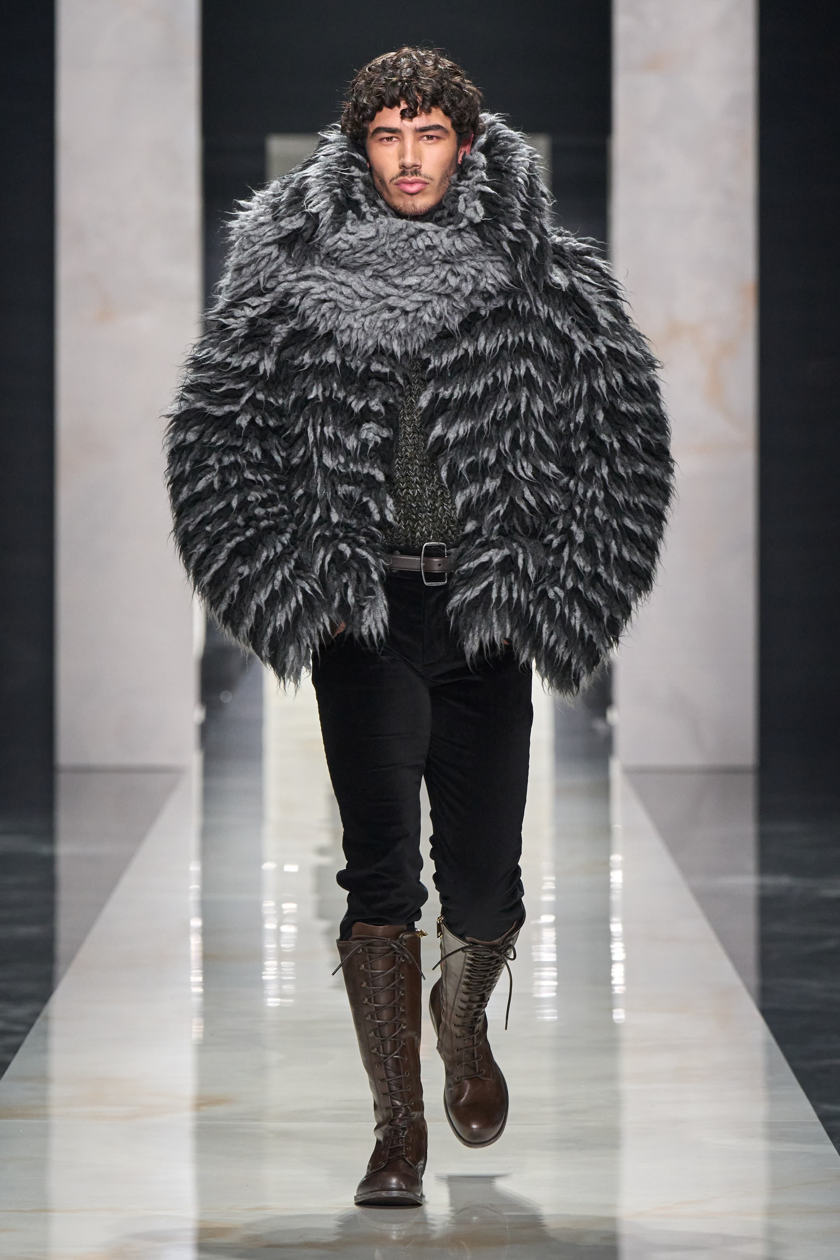 Far from a typical traditional runway, the catwalk functioned as a gallery. Models emerged from within the audience, moved across the space and only then stepped onto the central path, as if each one were entering the scene with his own story. The set — a marble-effect runway — created a certain visual friction, while reinforcing the idea of a contemporary portrait: figures in motion, crossing paths, observing one another. From the outset, the message was clear: the focus was on the casting, on the singularity of each model as the absolute protagonist of his look.