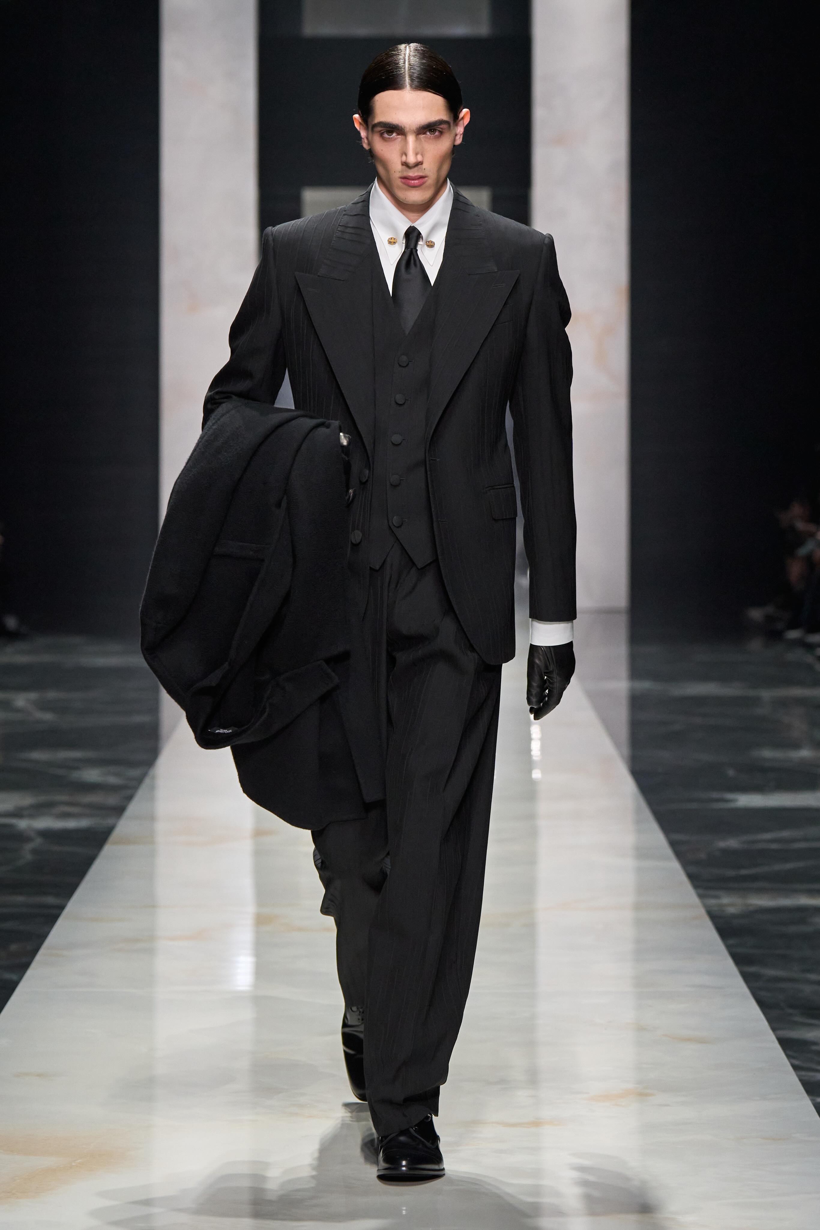 Tailoring was, once again, the strongest point of Domenico Dolce and Stefano Gabbana. Speckled Donegal tweed suits, wool and cashmere blends, impeccably constructed coats. A stone-grey suit with an almost gangster silhouette, wide lapels and relaxed trousers marked one of the most precise moments at the opening. A three-piece variation also stood out, where the jacket gave way to a black mohair sweater.