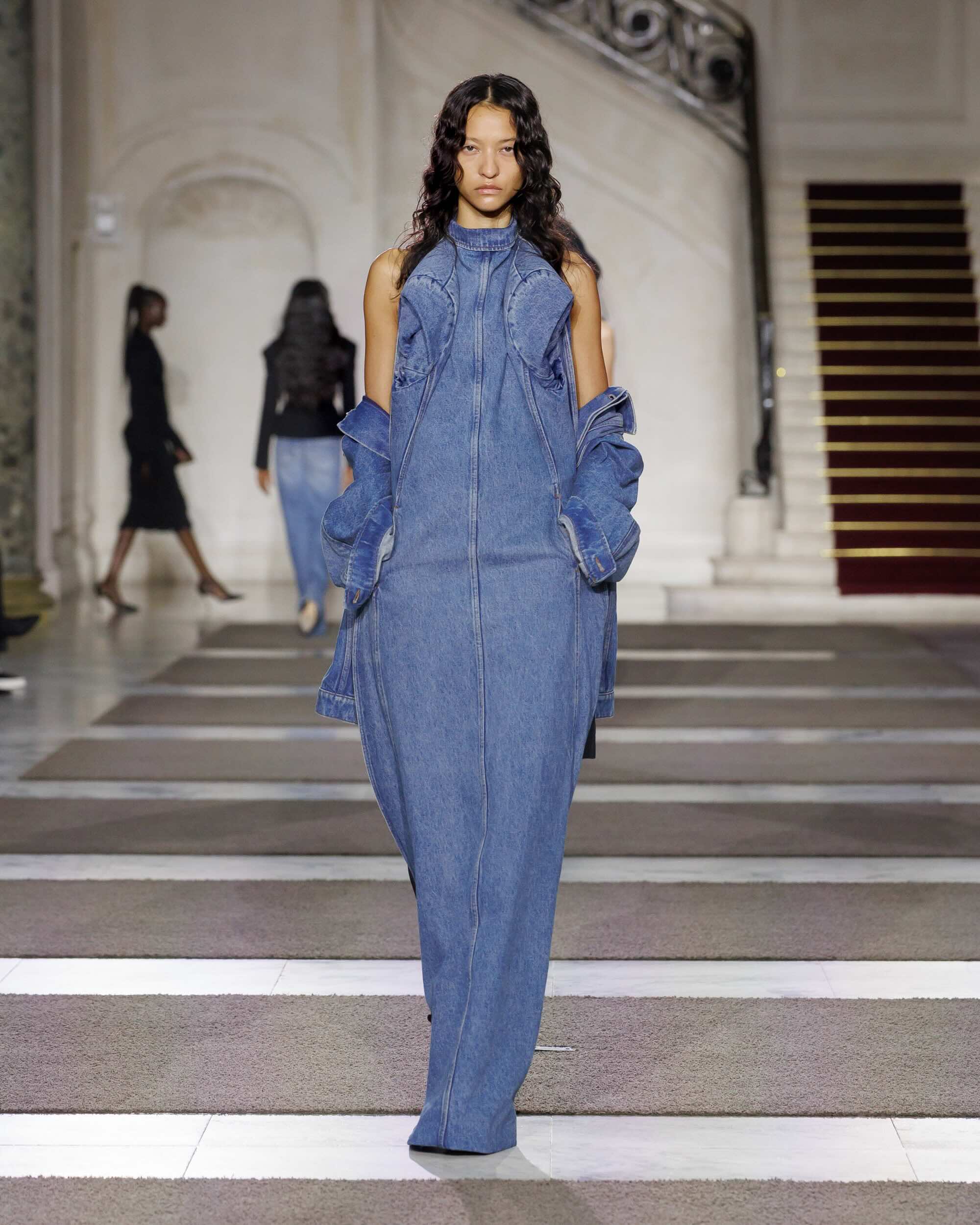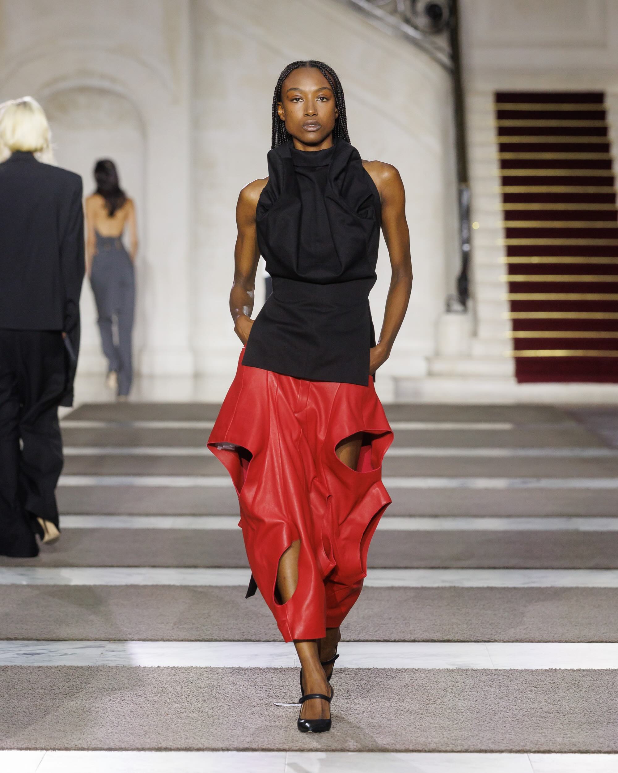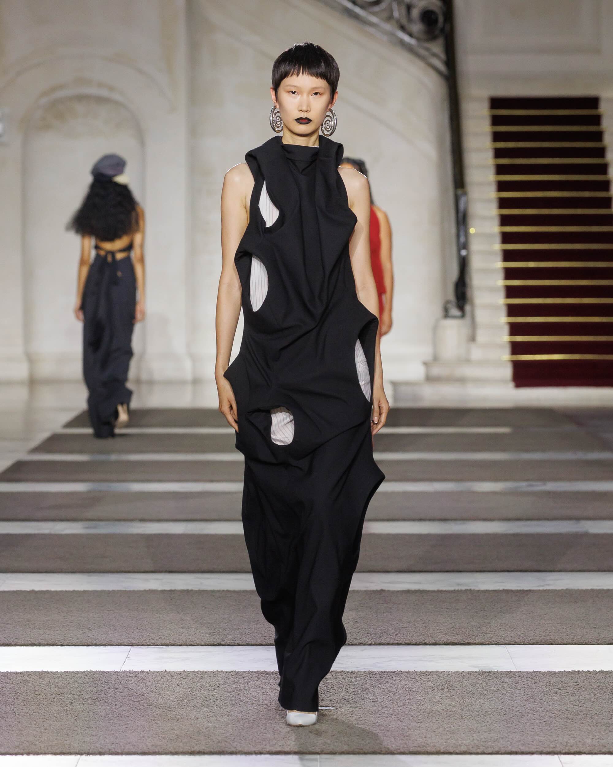 Los materiales también juegan con la dualidad: orgánicos frente a sintéticos, suaves pero inquietantes al tacto. El resultado son prendas que se sienten vivas, casi como organismos que mutan bajo la presión cultural y la desintegración personal.