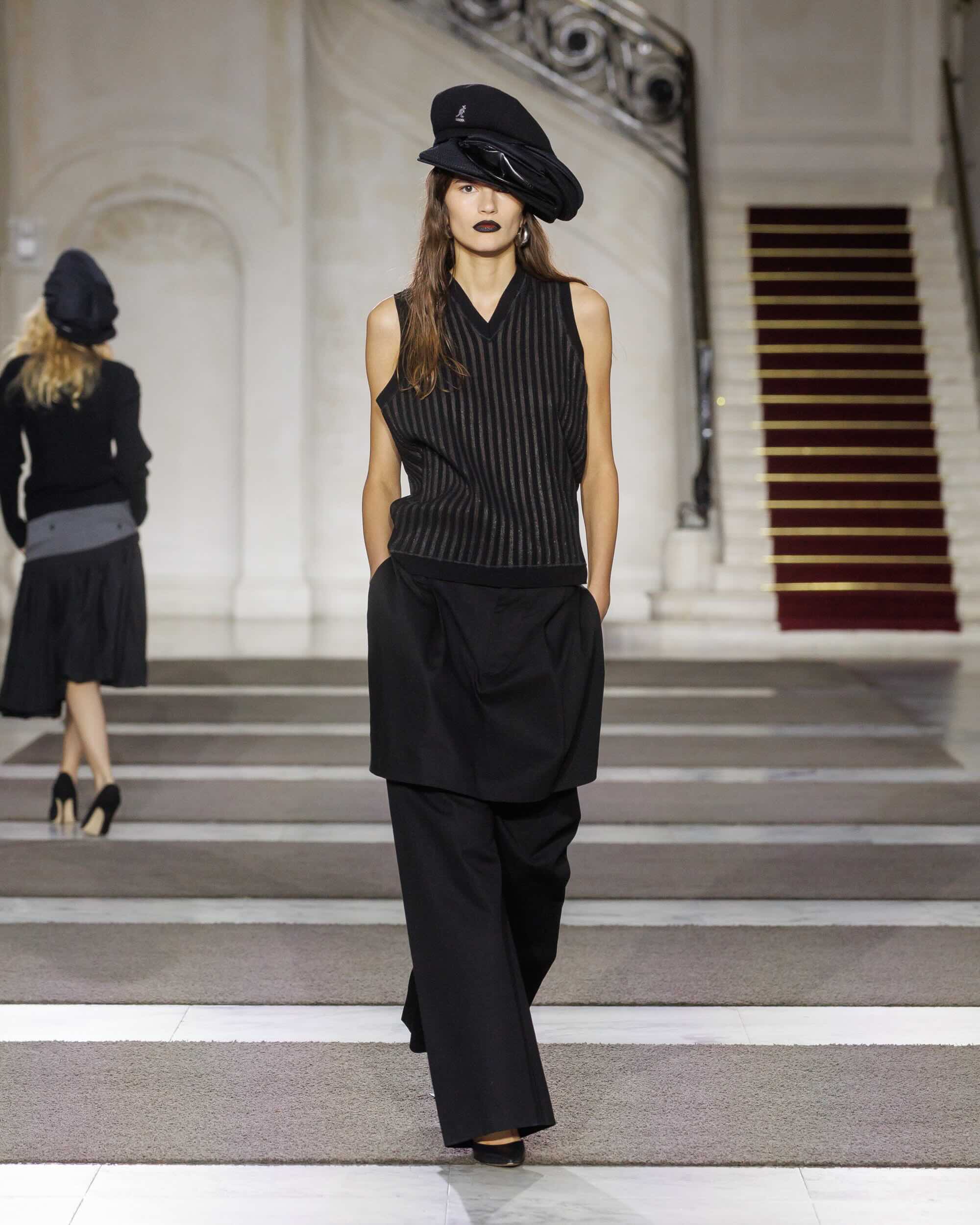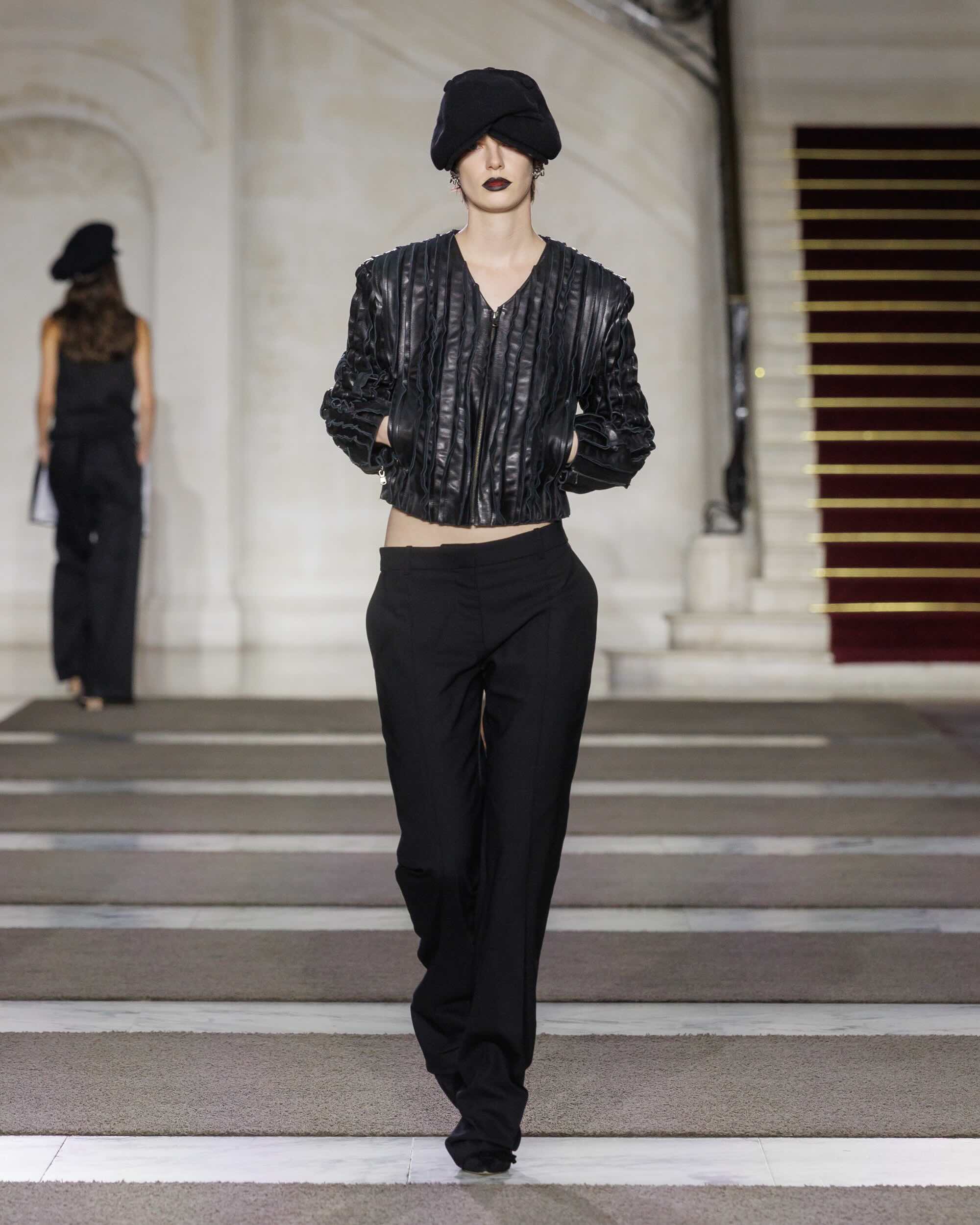 Silhouettes that recall school, military, or industrial codes are twisted, dismantled, and pushed toward alienation. Details — beadwork spreading like viral thoughts, unfinished hems, abrupt asymmetries — mirror a saturated and contradictory state of mind.