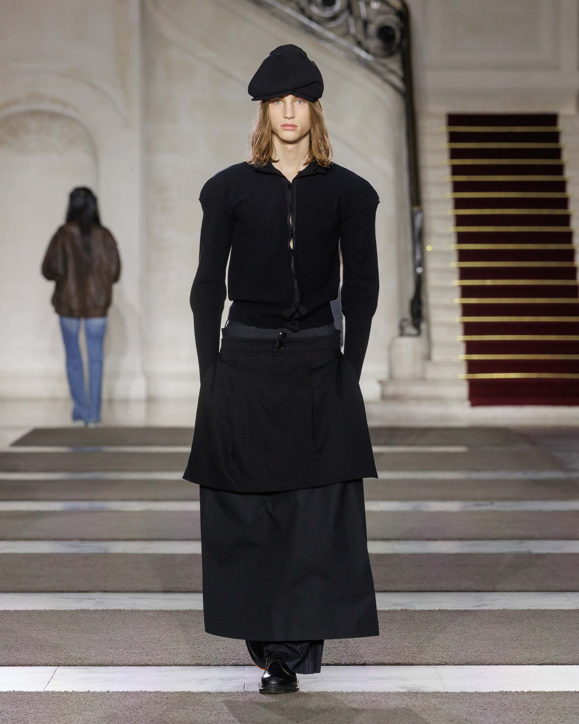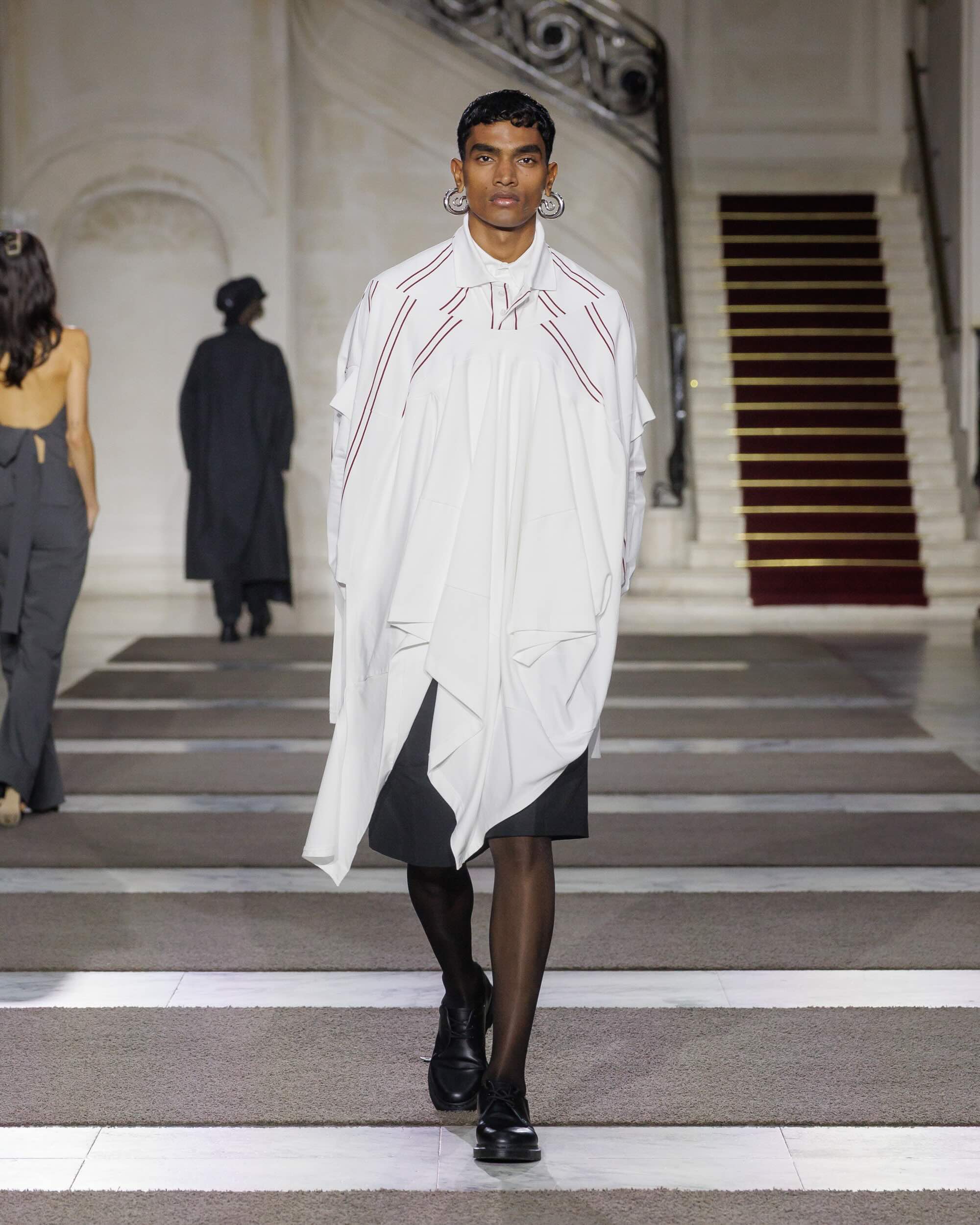 Torishéju's Spring/Summer 2026 collection unfolds as a manifesto in motion. At its core lies the tension between order and chaos, taking the idea of the uniform and subjecting it to a storm of distortions, fragmented memories, and shifting references.